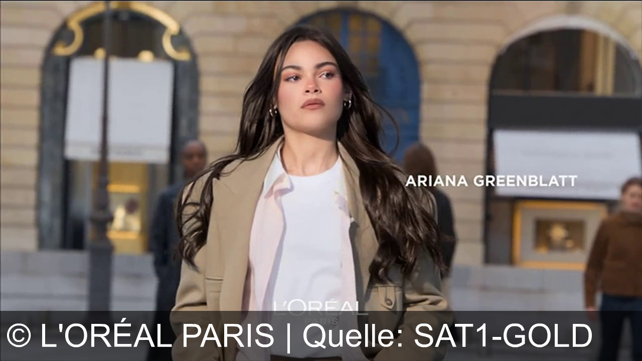 Eine Frau mit langen, braunen Haaren trägt einen hellen Mantel und ein weißes T-Shirt. Im Hintergrund stehen verschwommene Personen vor einem Gebäude mit Bögen. Oben rechts steht der Name "ARIANA GREENBLATT". Unten in der Mitte ist das Logo "L'ORÉAL PARIS" sichtbar.