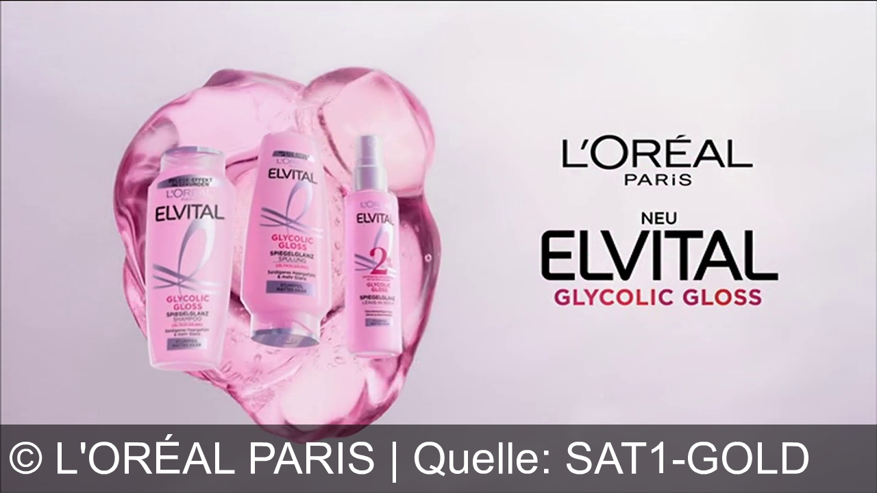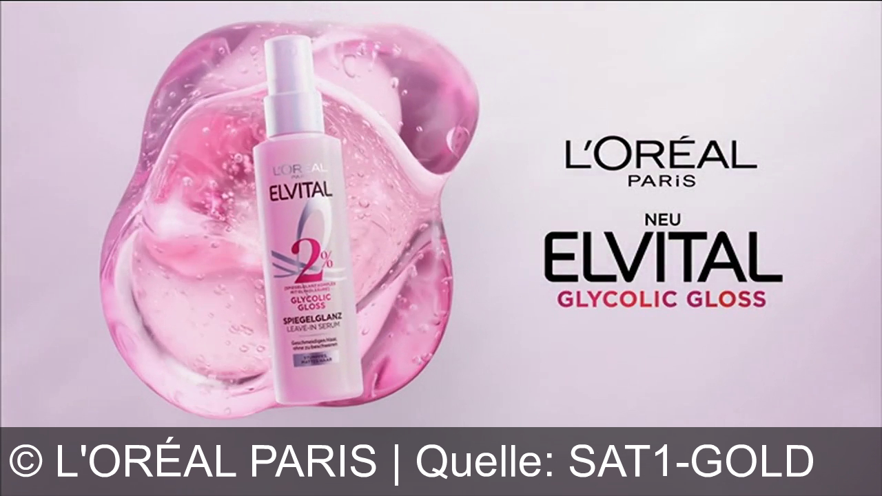 L'oréal Paris Werbung aus dem Jahr 2026 in Deutschland, mit dem von uns gewählten Titel: "L’Oréal Paris Elsève Glycolic Gloss: Strahlender Glanz und 24h Anti-Frizz-Schutz für Ihr Haar" mit der Kurzbeschreibung: "L'Oréal Paris Elvital Glycolic Gloss – für glänzendes, frizzfreies Haar wie ein Star. Spiegle deinen Glanz. Wir sind es uns wert!". Diese Werbung thematisiert oder beinhaltet die Kategorie/n Shampoo, Pflege, Kosmetik.
