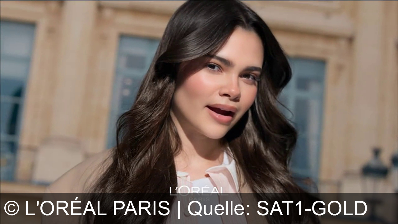 Eine Frau mit langen, welligen Haaren lächelt in die Kamera. Sie trägt eine helle Bluse und einen beigen Blazer. Der Hintergrund zeigt ein Gebäude mit großen Fenstern und klassischen Säulen. Unten im Bild steht der Schriftzug "L'ORÉAL PARIS".