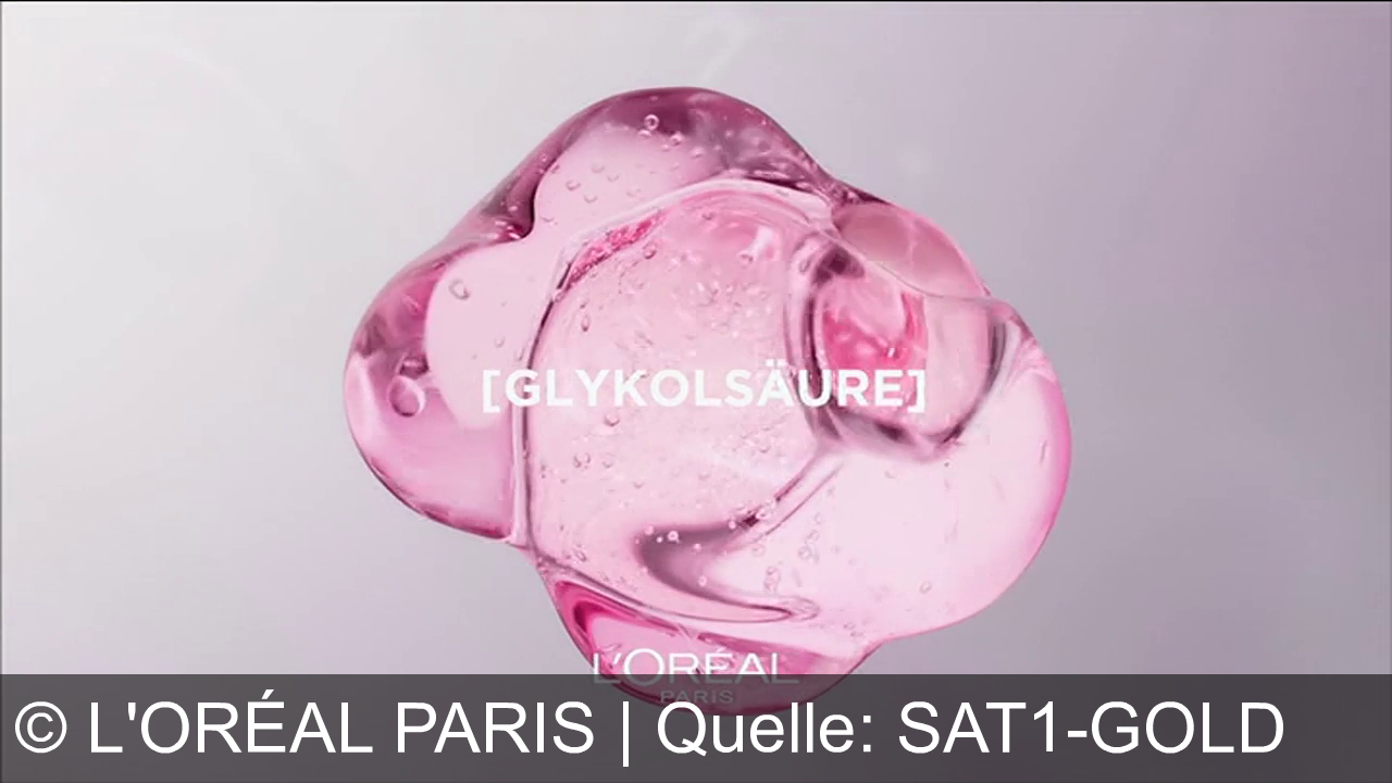 Ein rosa, glänzendes, blasenartiges Objekt schwebt vor grauem Hintergrund. Darüber steht in eckigen Klammern "GLYKOLSÄURE". Unten ist das L'Oréal Paris Logo zu sehen.