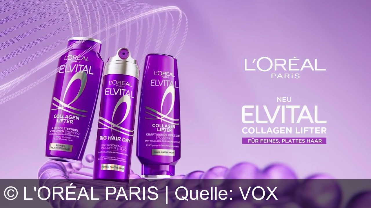 L'oréal Paris Werbung aus dem Jahr 2026 in Deutschland, mit dem von uns gewählten Titel: "L'Oréal Paris Collagen Lifter: Von platt zu powerful – 72h Volumen für Ihr Haar" mit der Kurzbeschreibung: "L'Oréal Paris Elvital Collagen Lifter: Für sofortigen Volumenlift bis zu 72 Stunden. Von platt zu powerful. Du bist es dir wert.". Diese Werbung thematisiert oder beinhaltet die Kategorie/n Shampoo, Haarspray, Kosmetik, Pflege.