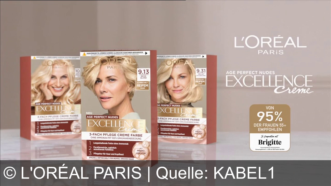 L'oréal Paris Werbung aus dem Jahr 2026 in Deutschland, mit dem von uns gewählten Titel: "Excellence Age Perfect Nudes von L’Oréal: Volle Deckkraft & 50% weniger Haarbruch für reifes Haar" mit der Kurzbeschreibung: "Excellence Age Perfect Nudes von L'Oréal Paris: Für reifes Haar, empfohlen von Brigitte. Gillian Anderson ist es sich wert.". Diese Werbung thematisiert oder beinhaltet die Kategorie/n Haarfarbe, Kosmetik, Pflege.