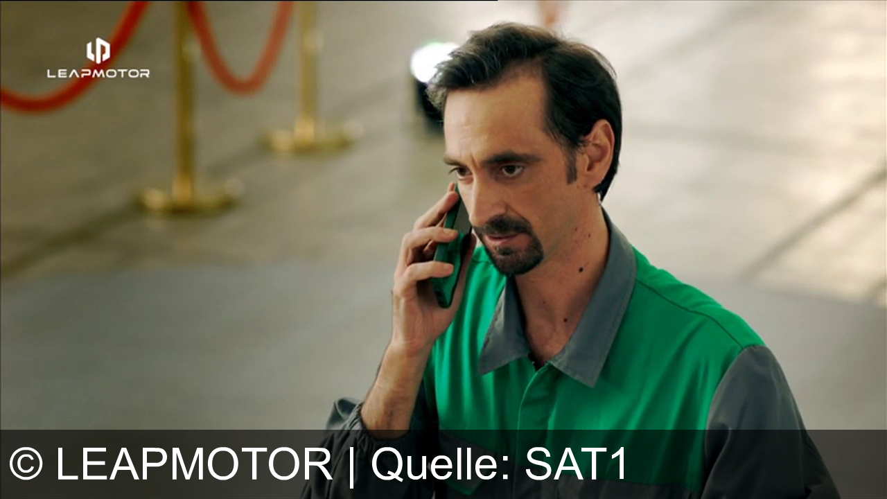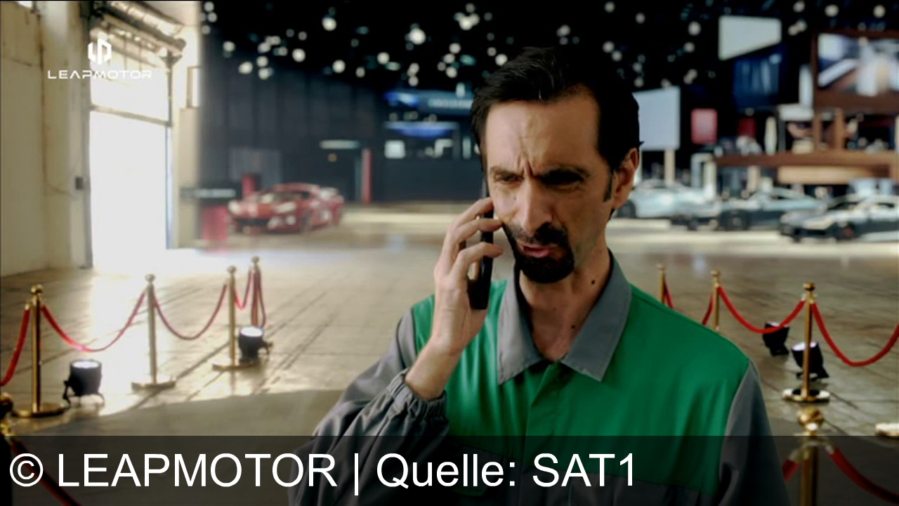 Ein Mann in einem grauen und grünen Arbeitsanzug telefoniert. Er steht in einer Halle mit roten Absperrungen und mehreren Autos im Hintergrund. Oben links steht "LEAPMOTOR". Die Beleuchtung ist gedämpft, mit vielen kleinen Lichtern an der Decke. Ein rotes Auto ist im Hintergrund zu sehen.