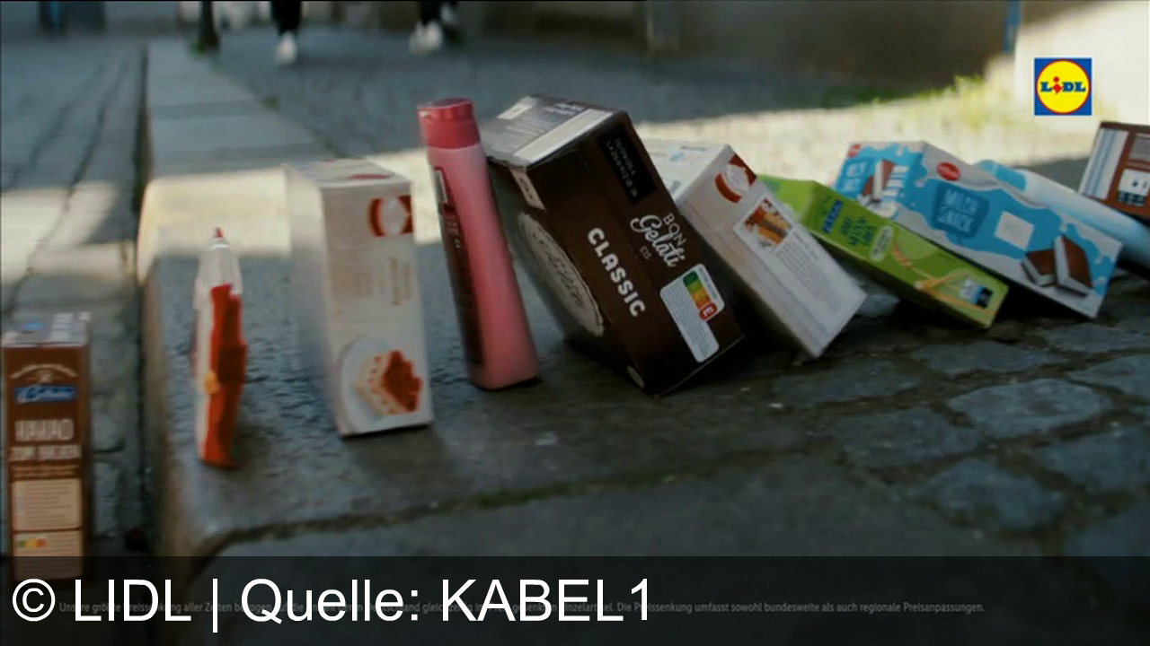 Verschiedene Verpackungen liegen auf dem Bürgersteig, darunter Eiscreme-Boxen und ein rosa Flakon. Im Hintergrund sind unscharf Menschenbeine zu sehen. Oben rechts befindet sich das Lidl-Logo. Der Boden besteht aus Pflastersteinen. Unten läuft ein Textband mit Informationen zur Preissenkung.