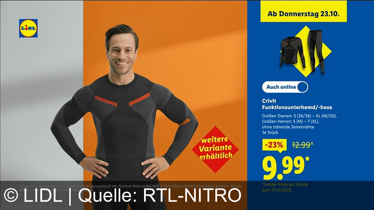 Ein Mann trägt Funktionsunterwäsche in Schwarz mit roten Details. Links oben sieht man das Lidl-Logo. Rechts ist ein orange-blauer Hintergrund mit Informationen über die Unterwäsche. Preis 9,99€ statt 12,99€, verfügbar ab 23.10. Online-Kauf möglich. Größen für Damen und Herren aufgelistet. "Weitere Variante erhältlich" in roter Raute steht links neben dem Mann.