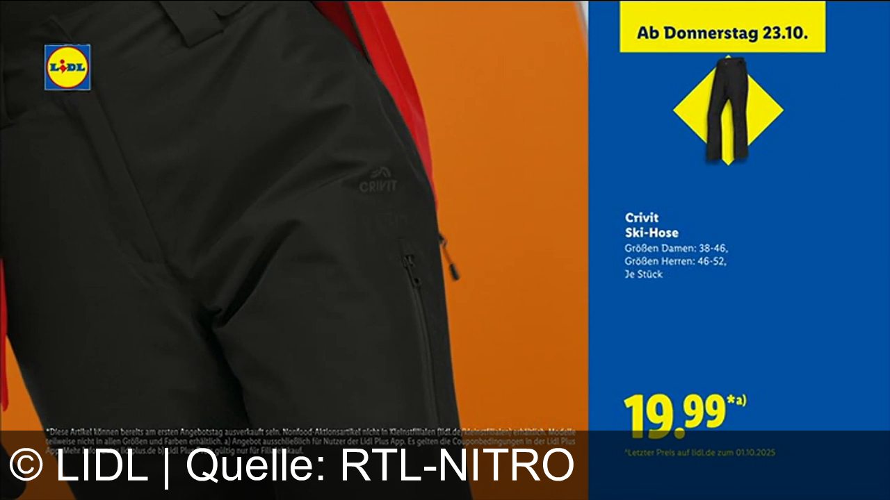 Links ist eine schwarze Ski-Hose von Crivit vor einem orangefarbenen Hintergrund. Rechts auf blauem Hintergrund stehen Infos: erhältlich ab Donnerstag, 23.10., für Damen (Größen 38-46) und Herren (Größen 46-52). Preis: 19,99€. Oben links sieht man das Lidl-Logo.