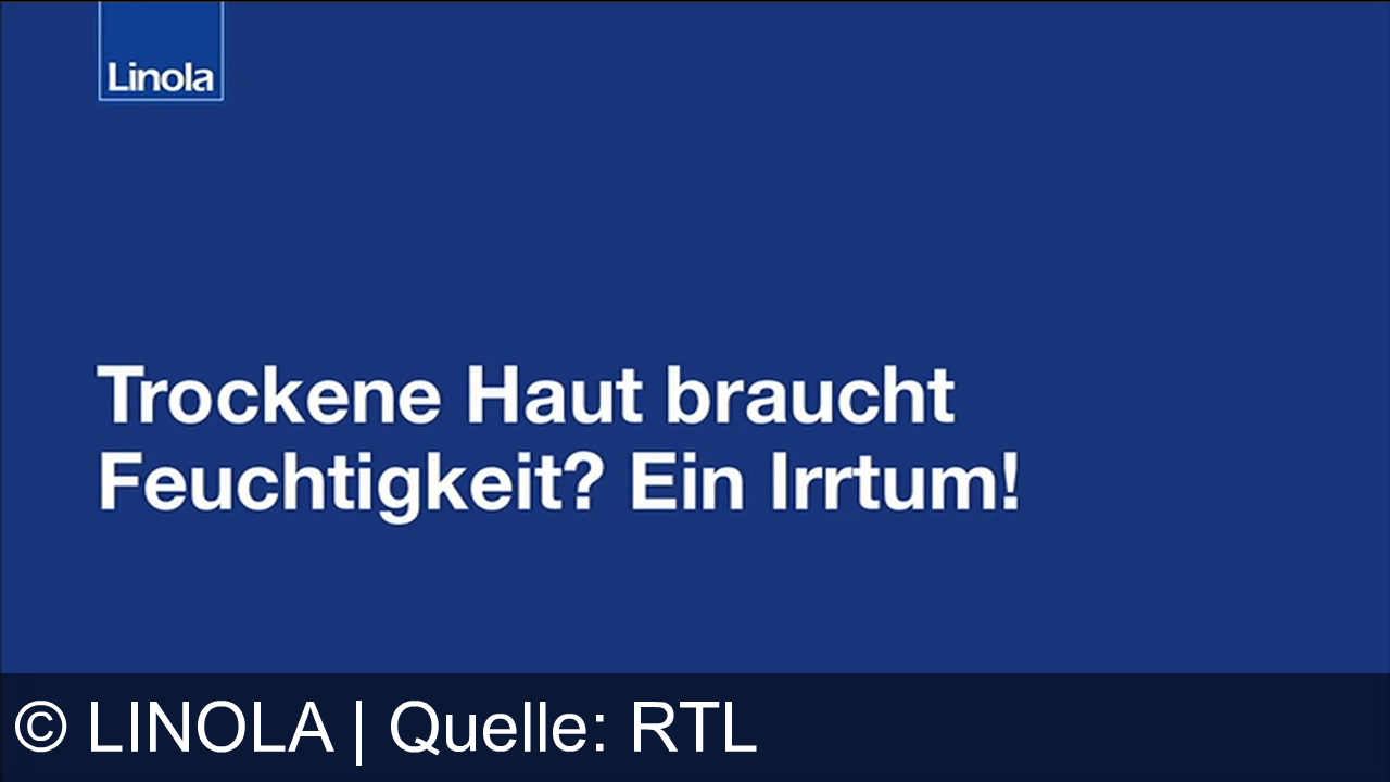 Blauer Hintergrund mit weißem Text. Oben links steht "Linola". Der Text lautet: "Trockene Haut braucht Feuchtigkeit? Ein Irrtum!"