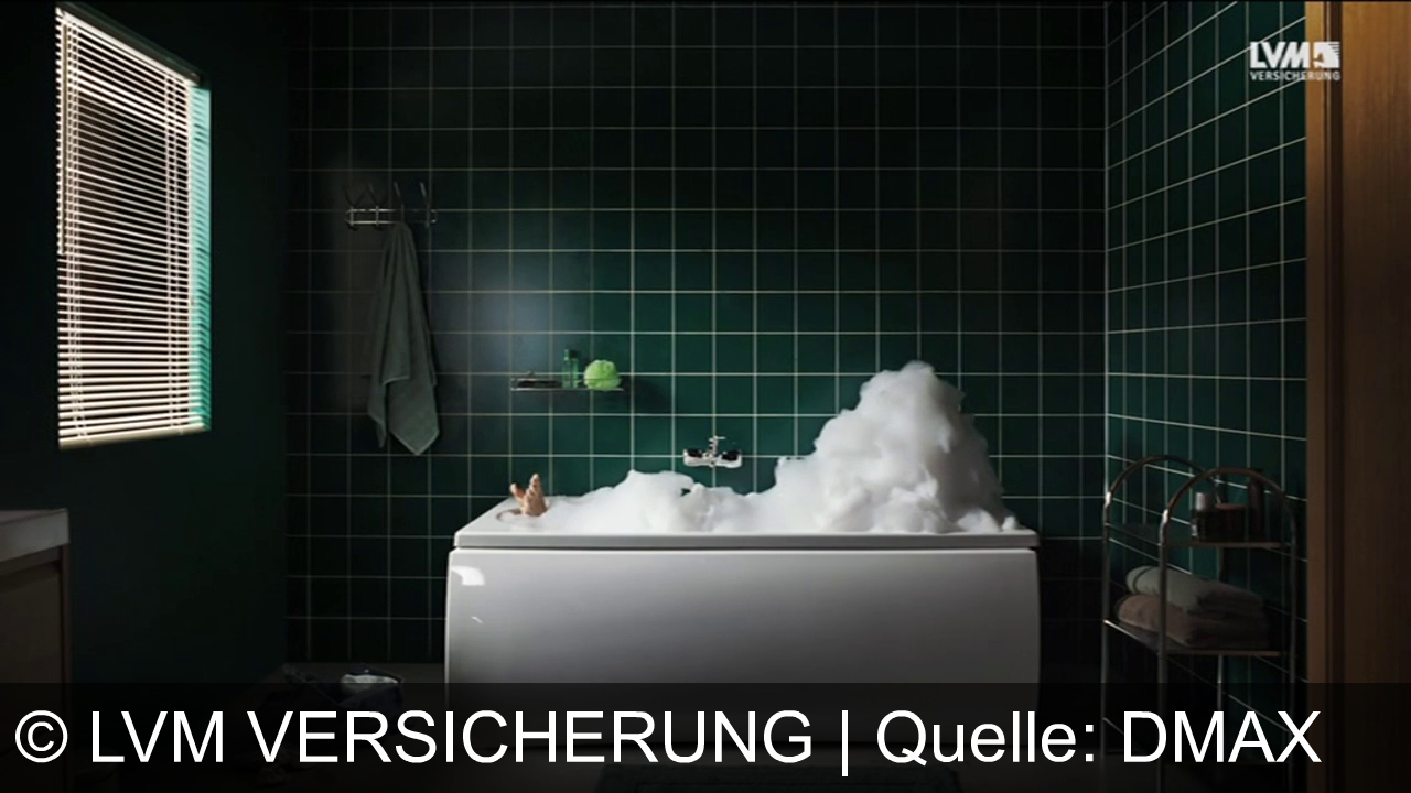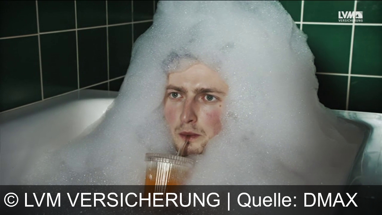 Schaum füllt die Wanne, zwei nackte Füße ragen raus und vorn steht das grüne LVM Versicherung Logo.