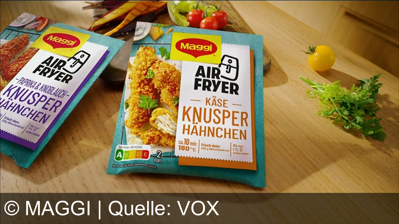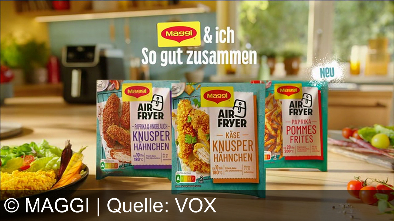 Maggi bewirbt neue Fix-Produkte speziell für den Airfryer, z.B. Knusperhähnchen, die knusprigen und leckeren Genuss einfach zuhause ermöglichen. Die Werbebotschaft: Große Vielfalt, schnelle Zubereitung und gemeinsamer Genuss – Maggi & ich, so gut zusammen.