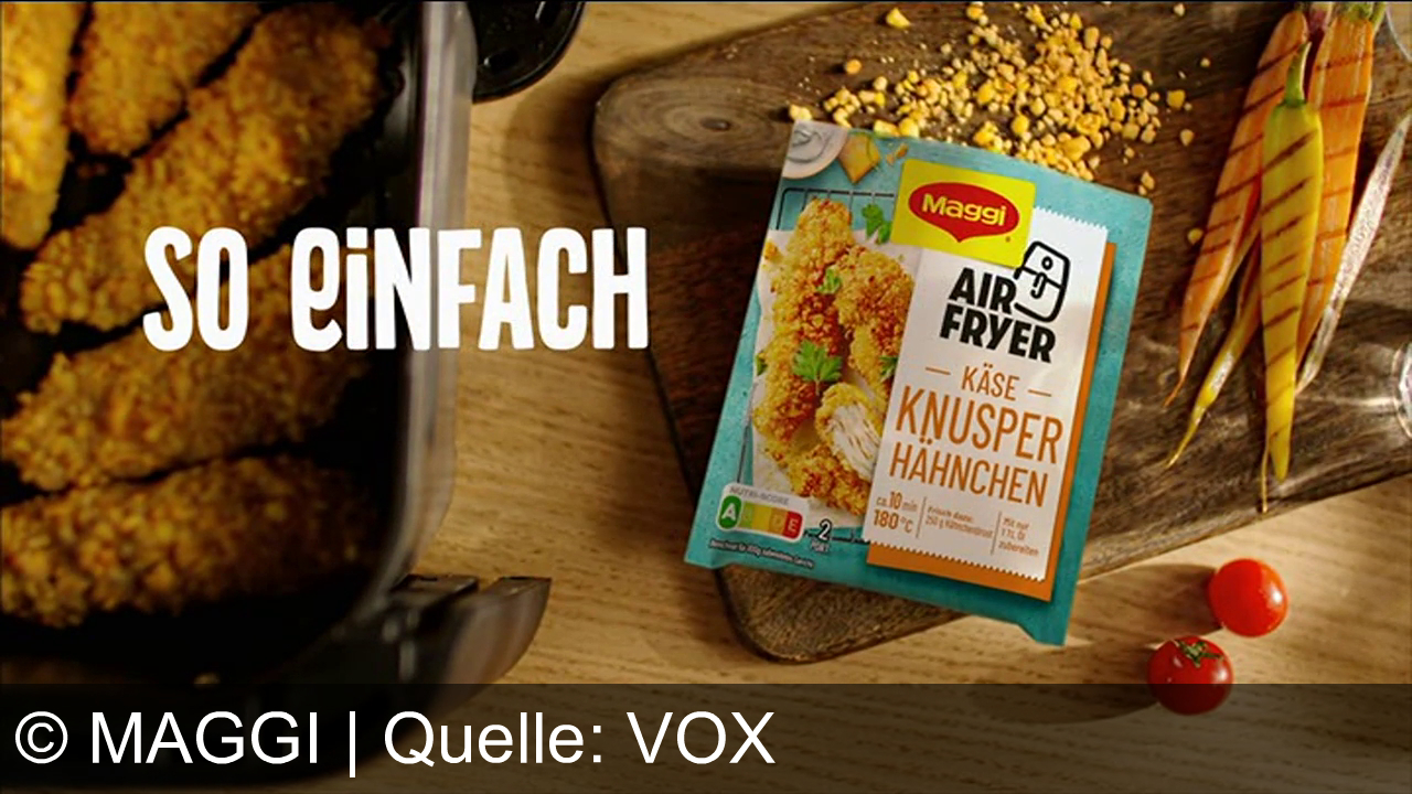 Werbung aus dem Jahr 2025 von Maggi in Deutschland, mit dem von uns gewählten Titel: "Maggi präsentiert neue Fix-Produkte für den Airfryer: Knuspriger Genuss schnell und einfach!" mit der Kurzbeschreibung: "So knusprig, so einfach, so lecker: Maggi Airfryer Fix & Co. – entdecke Maggi, das Franchises für Genussmomente! Maggi und ich – so gut zusammen. Jetzt leckere Vielfalt erleben!". Diese Werbung thematisiert oder beinhaltet die Kategorie/n Lebensmittel, Fleisch, Käse, Pommes, Gemüse.