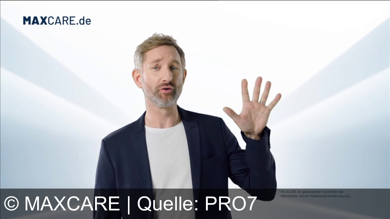 Ein Mann mit Bart trägt ein dunkelblaues Sakko und ein weißes T-Shirt. Er hebt seine rechte Hand, die Finger gespreizt. Im Hintergrund ein heller, weißer Hintergrund mit leichtem Blauton. In der oberen linken Ecke steht „MAXCARE.de“. Unten rechts kleiner Text: „MAXCARE ist gebundener Vermittler der Münchener Verein Krankenversicherung a.G.“
