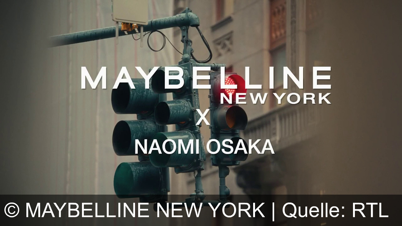 Eine Ampel mit rotem Licht im Vordergrund, Gebäude im Hintergrund. Text: "Maybelline New York x Naomi Osaka".