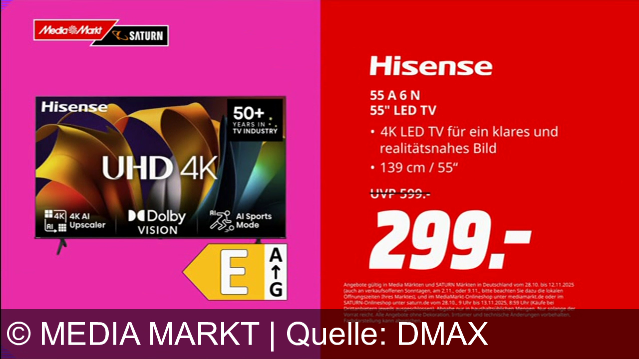 Links ein Hisense 55" UHD 4K LED TV mit 4K AI Upscaler, Dolby Vision und AI Sports Mode. "50+ Jahre in der TV-Industrie". Rechts der Preis 299€, vorher 599€. Energieeffizienzklasse E. Oben MediaMarkt und Saturn Logos. Rot-pinker Hintergrund mit weißer Schrift zu technischen Details und Angebotsbedingungen.