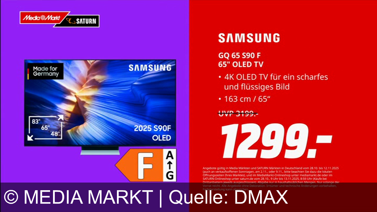 Links ein Samsung-Fernseher mit der Aufschrift "Made for Germany", rechts der reduzierte Preis von 1299 Euro. Oben Mediamarkt- und Saturn-Logos. Der TV ist ein GQ 65 S90 F, 65 Zoll OLED mit 4K. Ursprüngliche UVP 3199 Euro. Angebot gültig vom 28.10. bis 12.11.2025. Unten diverse Angebotsbedingungen.