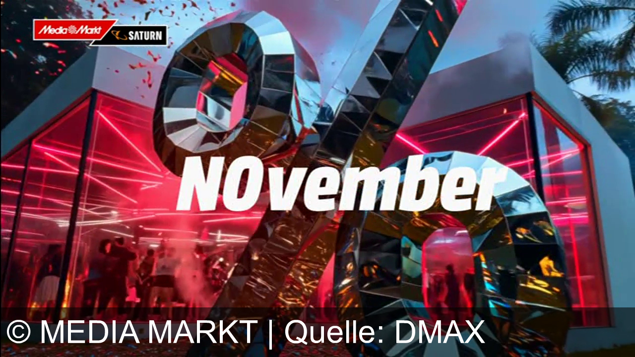 Ein gläsernes Gebäude mit roter Beleuchtung, Leute tanzen darin. Große, glänzende Prozentzeichen und der Text "NOvember" im Vordergrund. Oben links die Logos von MediaMarkt und Saturn. Konfetti fliegt in der Luft, im Hintergrund Palmen und rauchiger Himmel.