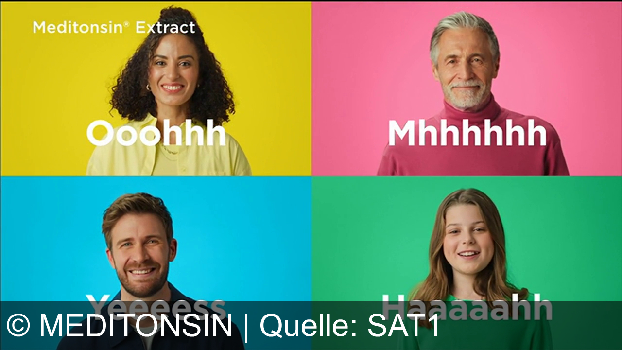 Vier Personen vor buntem Hintergrund. Oben links Frau auf gelbem Hintergrund mit "Ooohhh". Oben rechts Mann auf rosa Hintergrund mit "Mhhhhh". Unten links Mann auf blauem Hintergrund mit "Yeeeess". Unten rechts Mädchen auf grünem Hintergrund mit "Haaaahh". Oben links Schriftzug "Meditonsin® Extract". Alle lächeln.