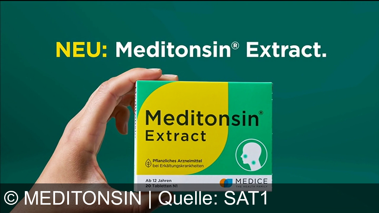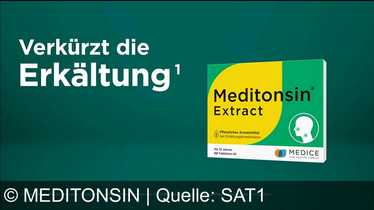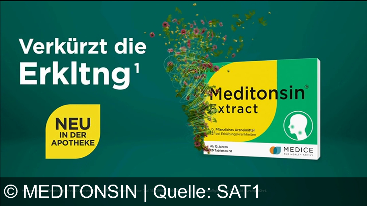 Meditonsin Werbung aus dem Jahr 2026 in Deutschland, mit dem von uns gewählten Titel: "Meditonsin® Extract: Pflanzliches Arzneimittel verkürzt Erkältung um bis zu drei Tage" mit der Kurzbeschreibung: "Schneller gesund mit dem neuen Meditonsin-Extrakt – Pflanzenpower gegen Erkältung. Jetzt exklusiv in Ihrer Apotheke!". Diese Werbung thematisiert oder beinhaltet die Kategorie/n Erkältungsmittel, Medikamente, Apotheke, Gesundheit.