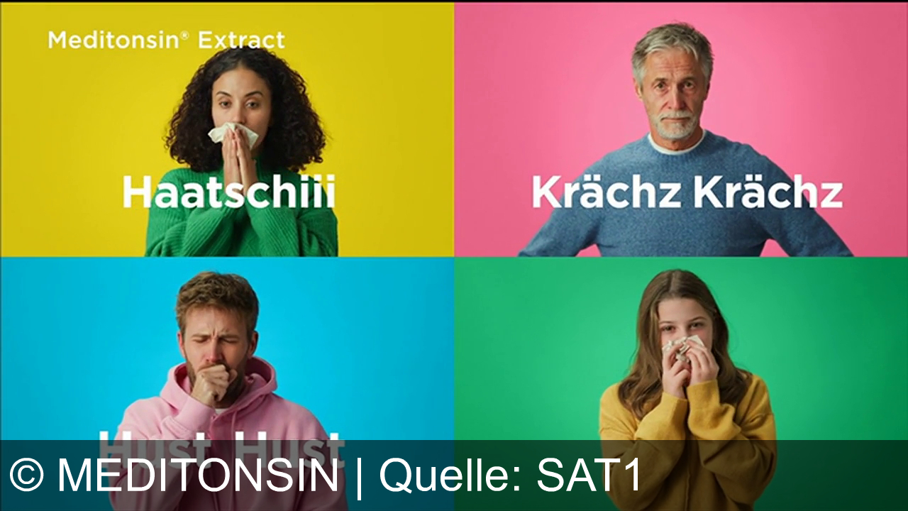 Vier Personen in quadratischen Feldern mit bunten Hintergründen. Oben links: Frau mit Taschentuch, gelber Hintergrund. Oben rechts: Mann mit grauem Haar, pinker Hintergrund. Unten links: Mann hustend in pinkem Hoodie, blauer Hintergrund. Unten rechts: Mädchen mit Taschentuch, grüner Hintergrund. Text: "Meditonsin® Extract", "Haatschiii", "Krächz Krächz", "Hust Hust".