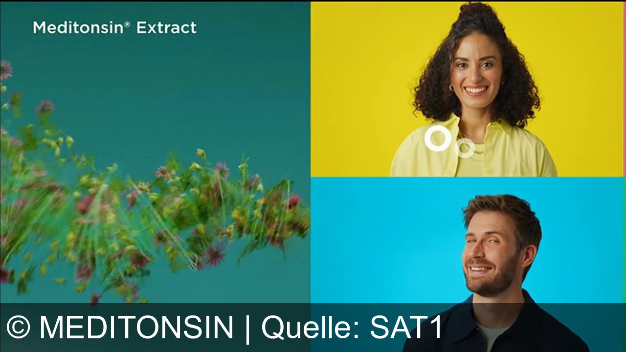 Zwei Personen, eine Frau vor gelbem Hintergrund und ein Mann vor blauem Hintergrund, beide lächelnd. Links bewegt sich eine bunte Ansammlung von Blüten auf grünem Hintergrund. Oben links steht "Meditonsin® Extract".