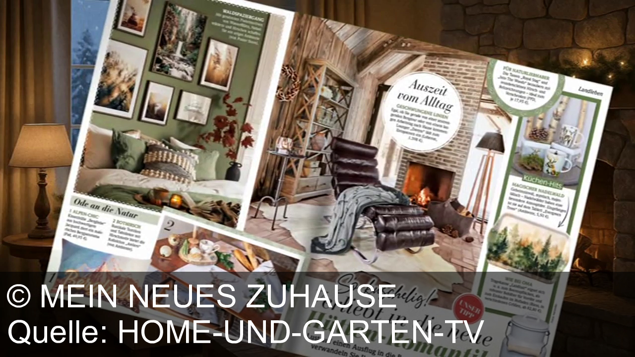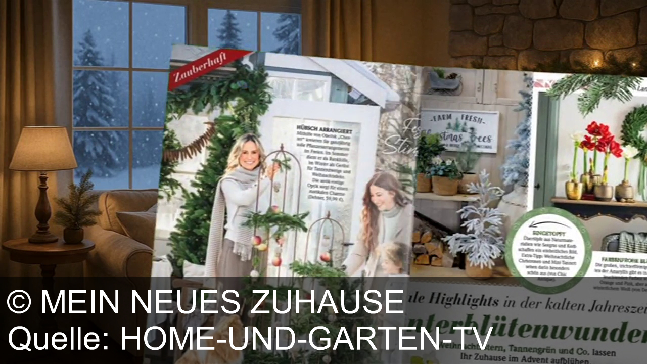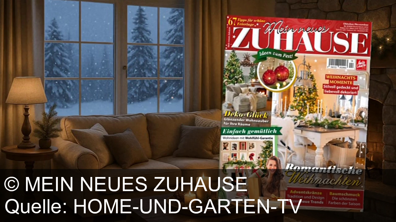 Gemütliches Wohnzimmer, draußen schneit es. Fensterblick auf verschneite Tannenbäume. Innen brennt eine Lampe neben einem Sofa, mehrere Kerzen auf dem Tisch. Ein Kamin ist zu sehen. Im Vordergrund ein Magazincover mit Weihnachten als Thema, dekorierte Räume und festliche Tipps. Der Magazine-Titel ist "Mein neues Zuhause". Weihnachtlich geschmückte Zimmer und kreative Dekoideen sind abgebildet.
