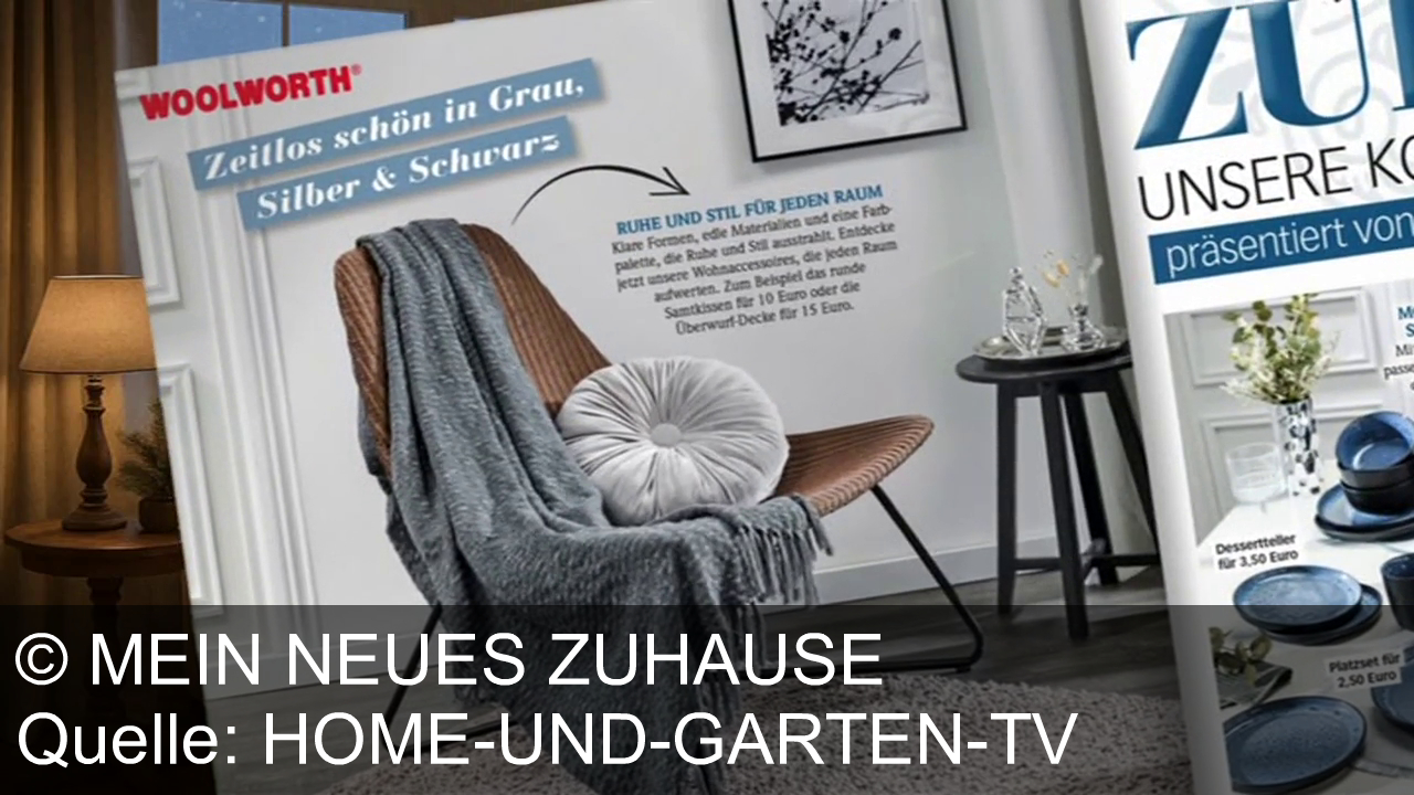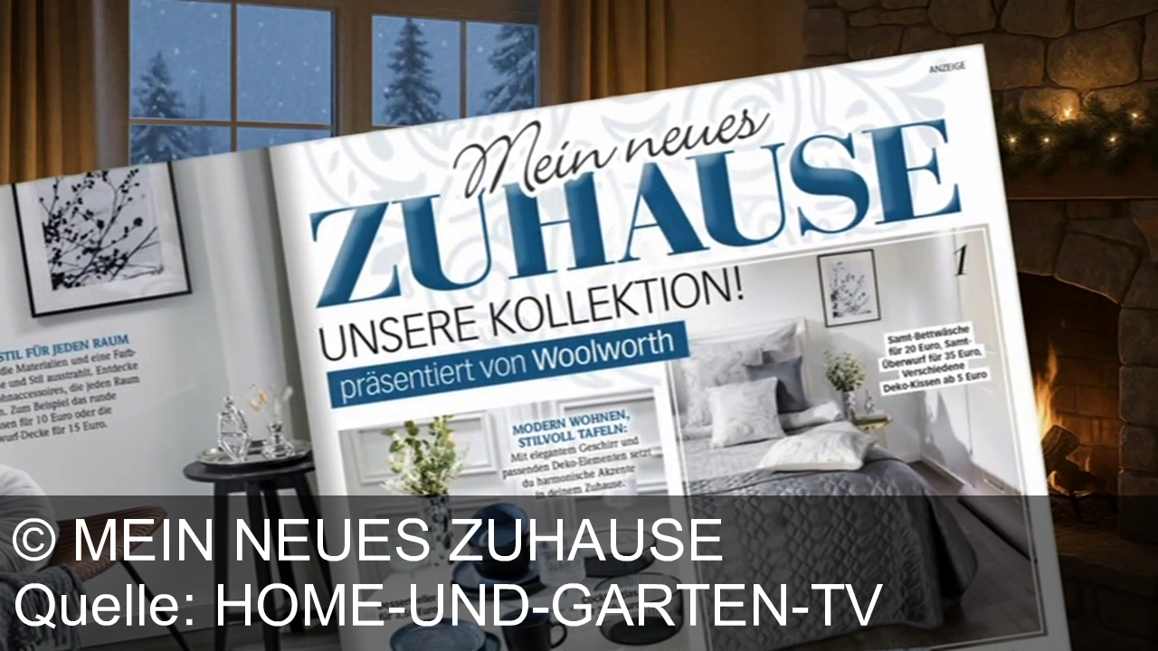 Ein Wohnzimmer mit Kamin und Winterlandschaft draußen. Eine Broschüre mit der Aufschrift "Mein neues ZUHAUSE" präsentiert von Woolworth. Angeboten werden Samt-Bettwäsche, Dekokissen und Geschirr. Rechts im Bild ein gemütliches Bett. Links ein Beistelltisch mit Blumen, im Hintergrund ein gerahmtes Bild.