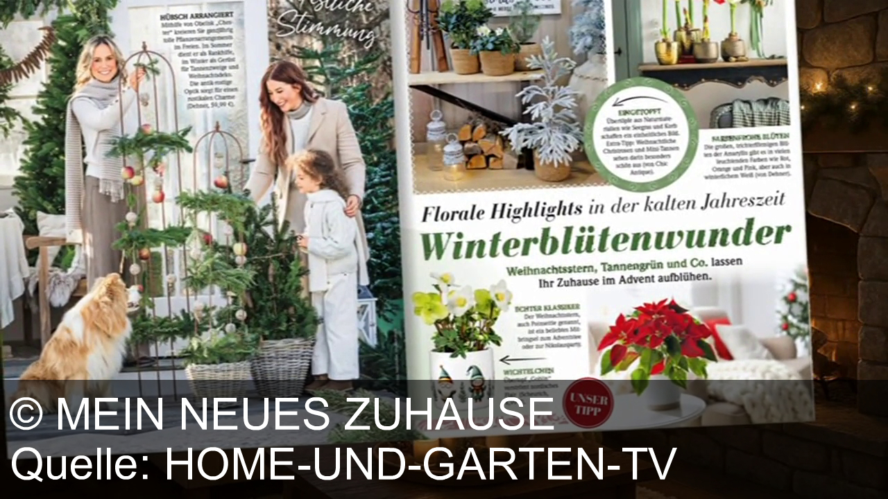 Eine Frau, ein Kind und ein Hund stehen neben einem dekorierten Baum. Weihnachtsdekoration in einem gemütlichen Raum. Auf der rechten Seite sind winterliche Pflanzen und Dekorationstipps zu sehen. Texte beschreiben florale Highlights und geben Ratschläge zur Dekoration in der Weihnachtszeit. Im Hintergrund brennt ein Kaminfeuer.