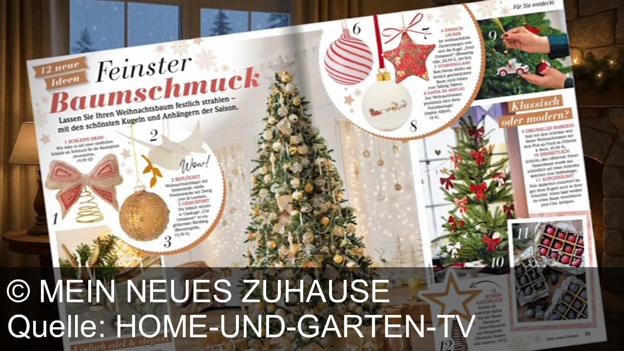 Eine Zeitschriftenseite mit dem Titel "Feinster Baumschmuck". Verschiedene Weihnachtsbaumdekorationen wie Kugeln, Schleifen und Sterne sind abgebildet. Ein festlich geschmückter Weihnachtsbaum steht im Zentrum, umgeben von Geschenken. Rechts unten sind Plätzchen in einer Box. Der Hintergrund zeigt ein dekoriertes Wohnzimmerfenster.