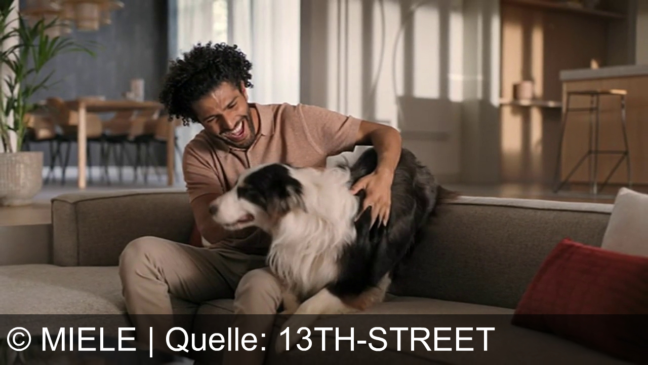 Ein Mann trägt ein beiges Hemd und helle Hose und spielt mit einem schwarz-weißen Hund in einem modernen Wohnzimmer mit Holzboden. Im Hintergrund steht eine schicke Küche mit Hockern. Vorne prangt ein rotes Logo mit dem Schriftzug "Miele". Links eine große Pflanze.