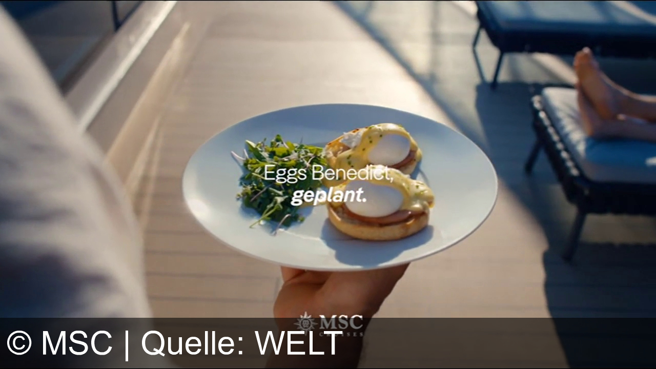 Eine Hand hält einen Teller mit Eggs Benedict und Salat. Im Hintergrund liegt eine Person auf einer Sonnenliege auf einem Deck. Text im Bild: "Eggs Benedict, geplant." und "MSC Cruises".