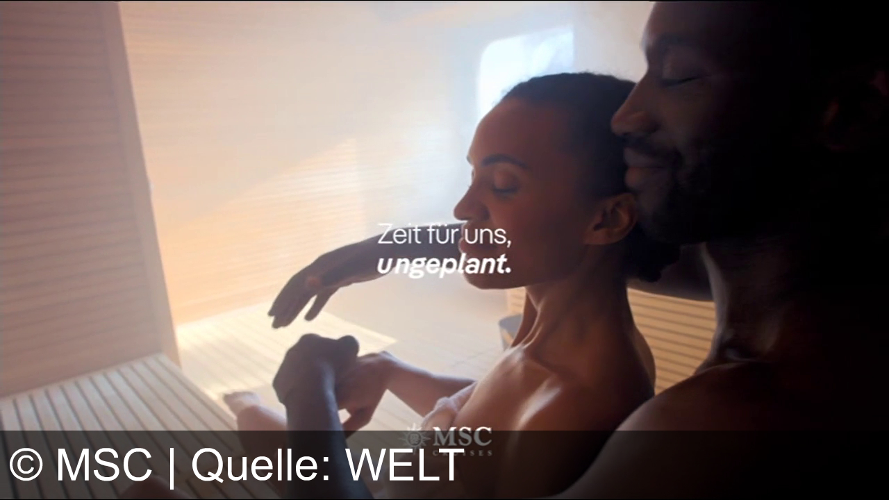 Ein Paar entspannt in einer Sauna. Die Frau sitzt vorne, der Mann hinter ihr. Der Raum ist aus Holz, sanft beleuchtet. Über dem Paar der Text: "Zeit für uns, ungeplant." Unten befindet sich das Logo von MSC Cruises.