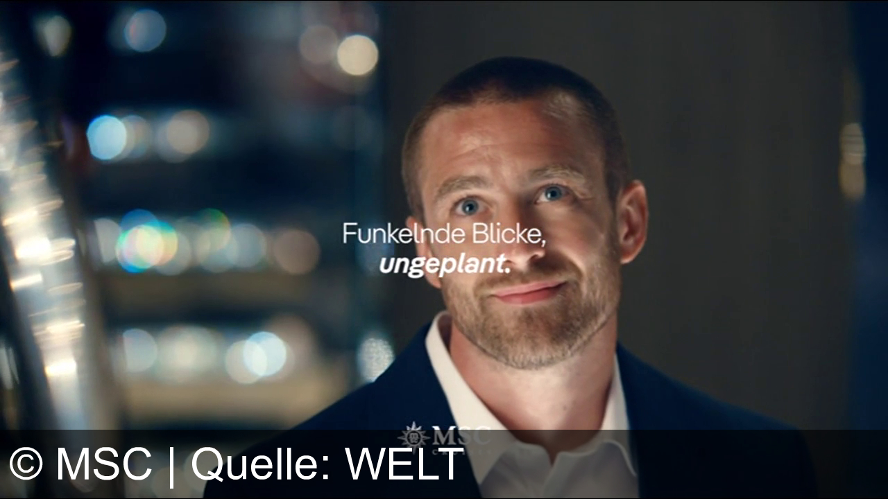 Ein Mann mit Bart in einem Anzug steht vor einem verschwommenen Hintergrund. Der Text "Funkelnde Blicke, ungeplant." erscheint über seinem Gesicht. Unten ist das Logo von MSC Cruises zu sehen.
