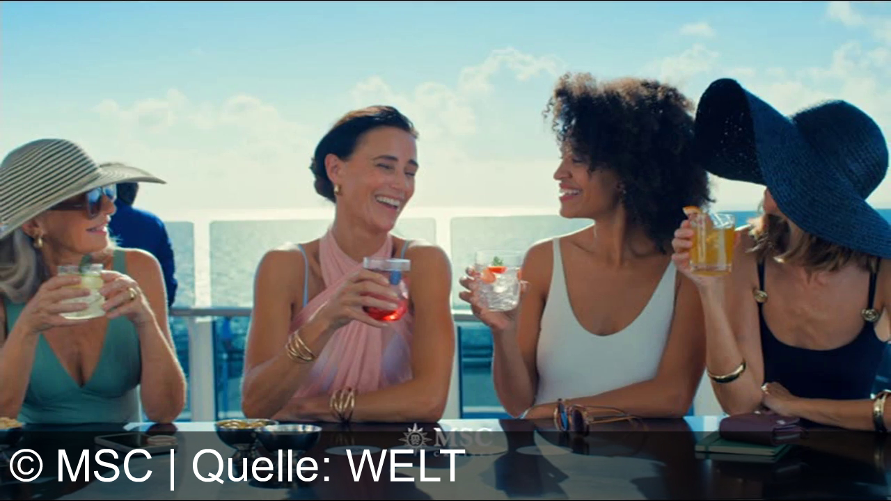 Vier Frauen sitzen lächelnd an einem Tisch und heben ihre Drinks, während sie sich ansehen. Im Hintergrund ist das Meer zu sehen. Jede trägt Sommerkleidung und Hüte. Der Tisch hat mehrere Schalen und Gläser. Unten im Bild steht "MSC".
