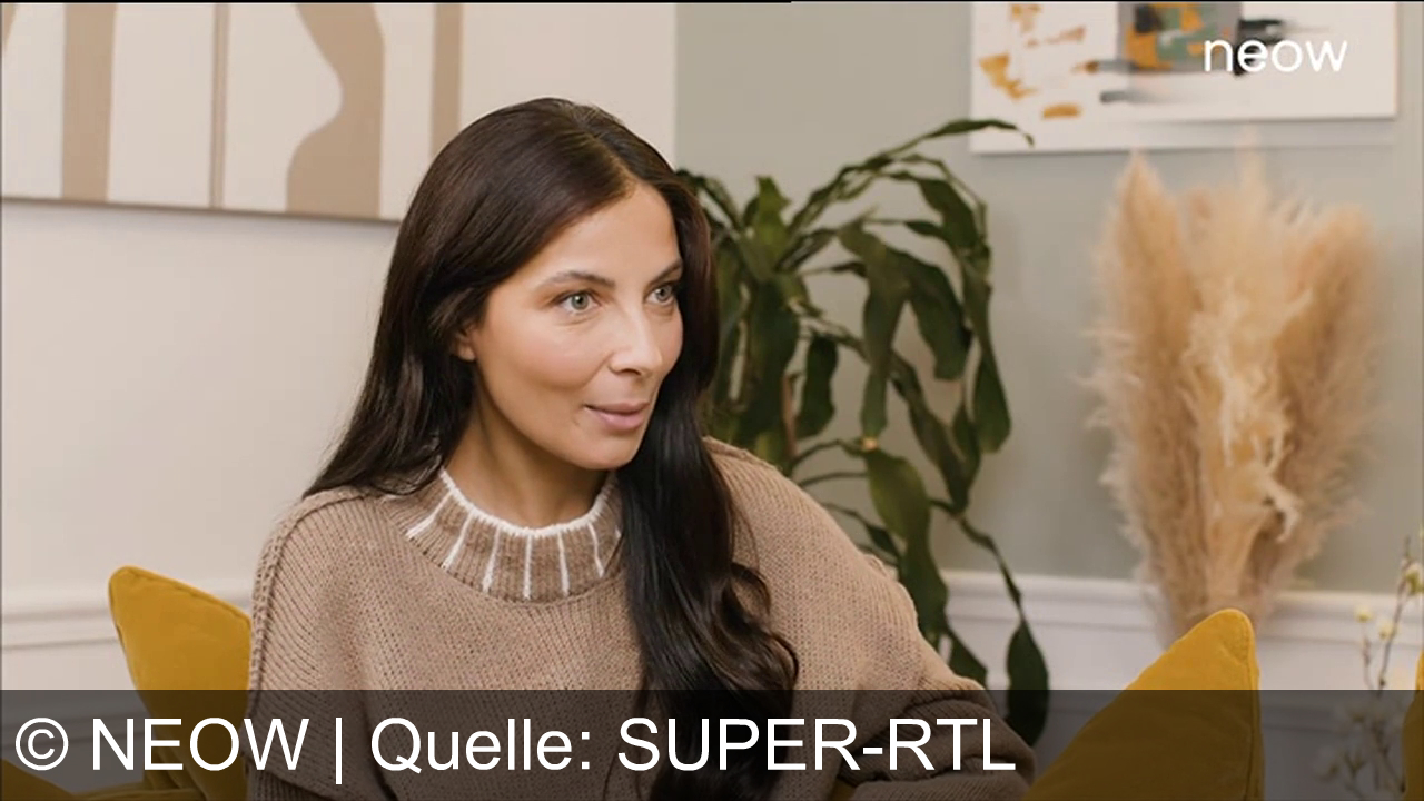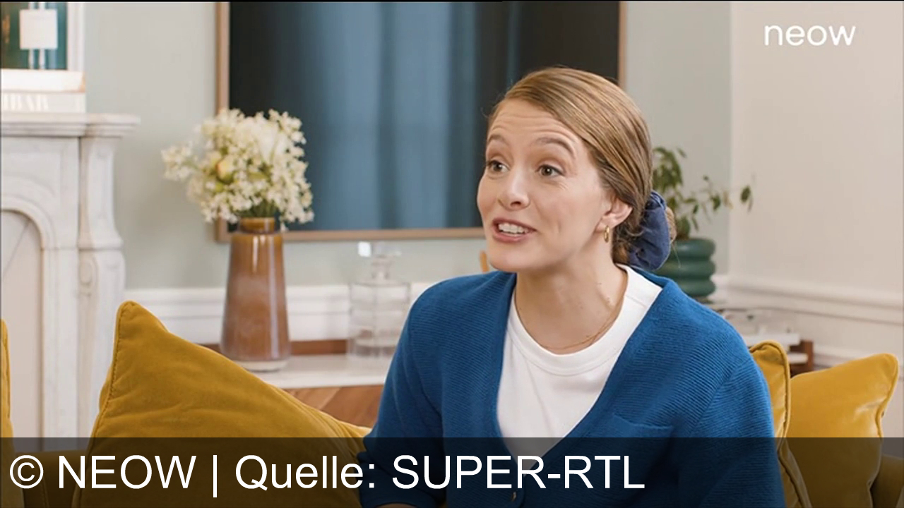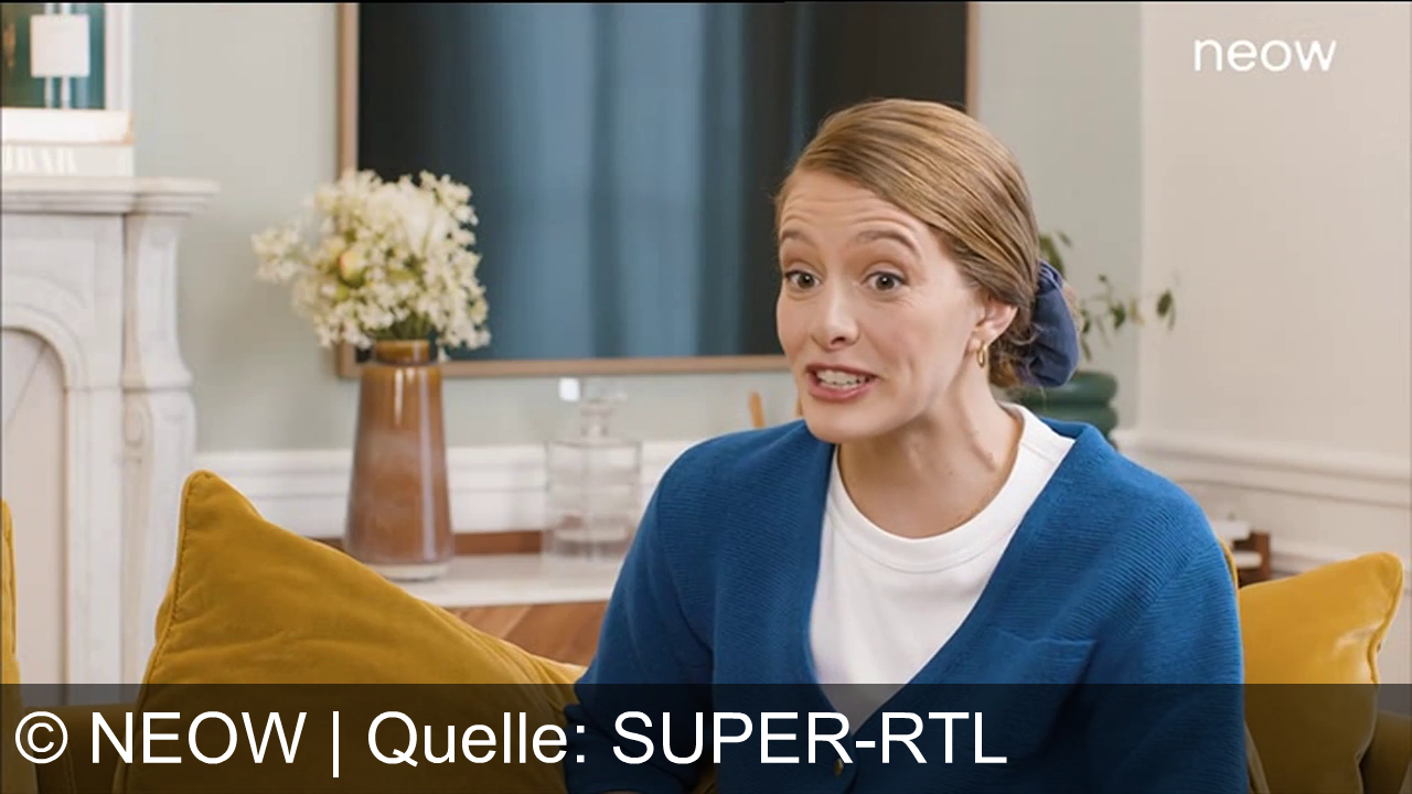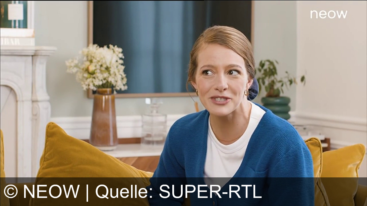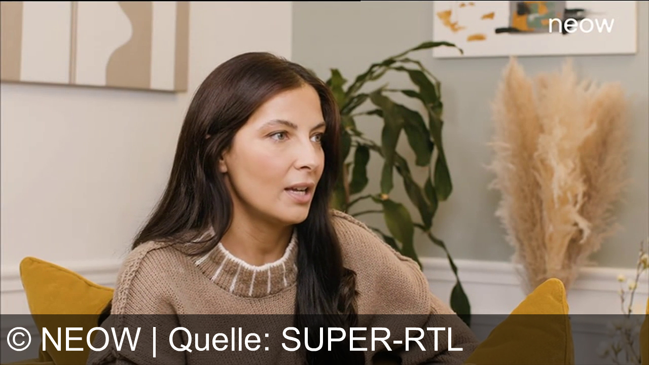 Eine Frau sitzt auf einem Sofa, trägt einen braunen Pullover. Im Hintergrund stehen Zimmerpflanzen und moderne Kunst hängt an der Wand. Rechts oben ist das Wort "neow" zu sehen.