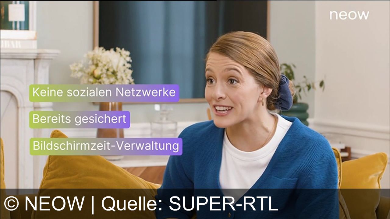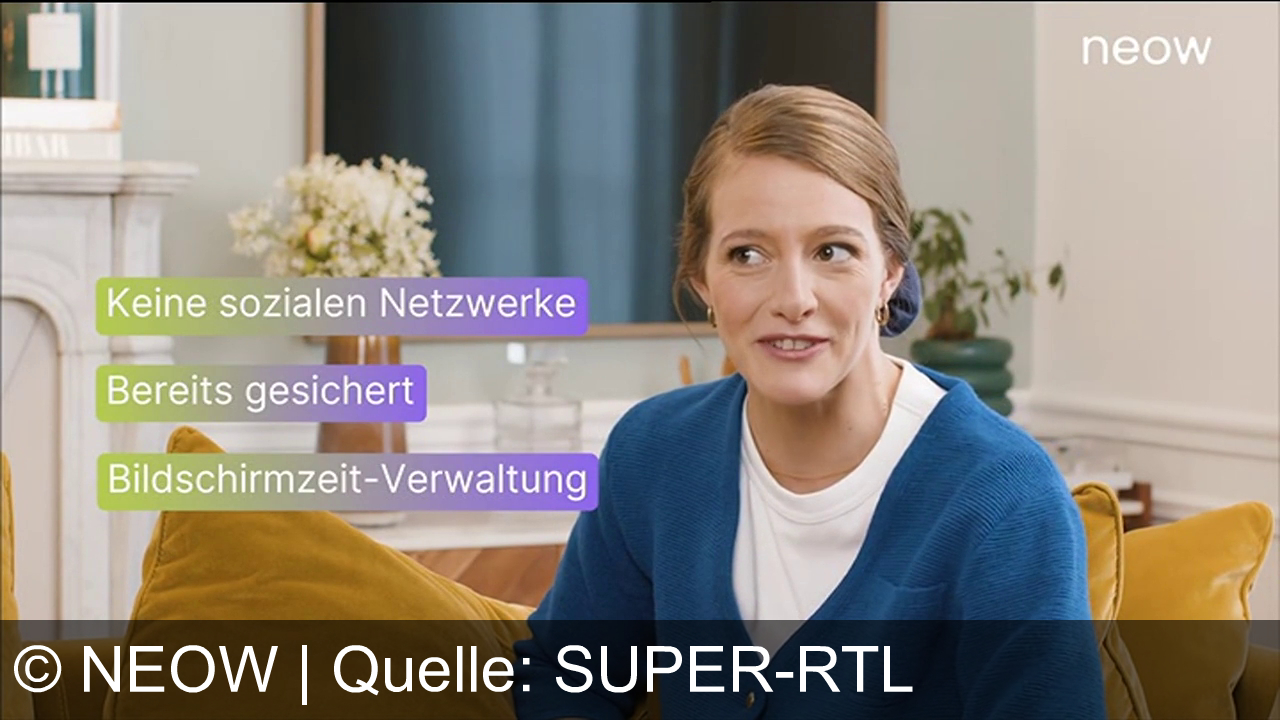 Eine Frau mit braunen Haaren trägt einen blauen Cardigan. Im Hintergrund ein heller Raum mit Blumen auf dem Tisch. Auf dem Bild stehen die Wörter "Keine sozialen Netzwerke", "Bereits gesichert" und "Bildschirmzeit-Verwaltung". Oben rechts ist das Logo "neow" zu sehen.