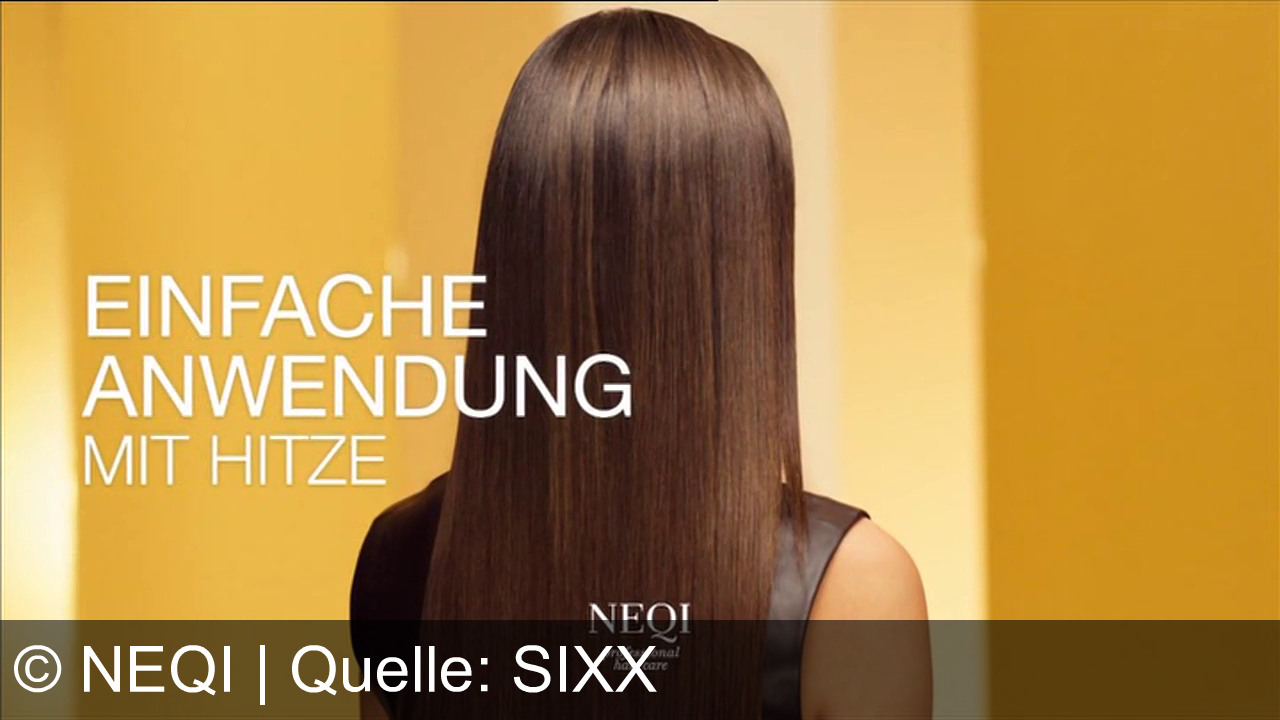 Eine Person steht vor gelbem Hintergrund und zeigt ihren glatt fallenden, langen Haaren, während große weiße Schrift mit Werbeaussagen eingeblendet ist. Unter dem Text steht der Produktname NEQI.