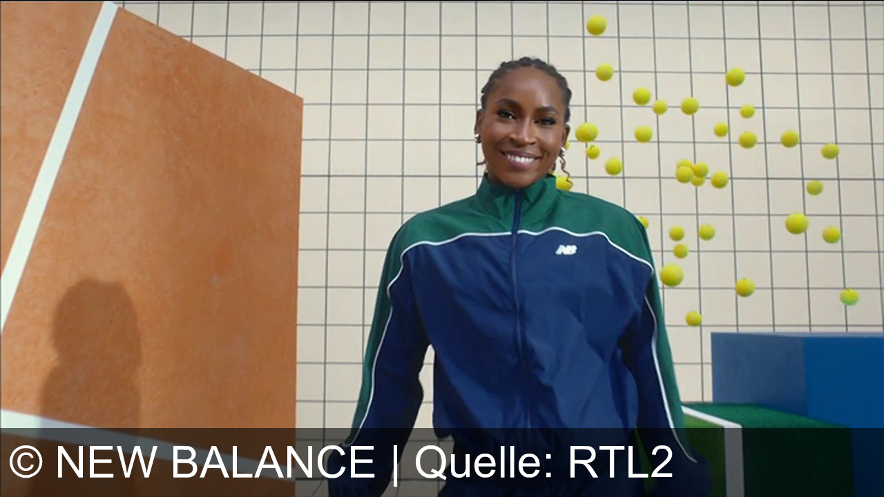 Eine Person mit Zöpfen trägt einen blau-grünen Trainingsanzug von New Balance. Im Hintergrund schweben gelbe Tennisbälle vor einer Wand mit quadratischem Muster. Links ist eine orangefarbene Fläche mit weißen Linien zu sehen. Die Person lächelt.