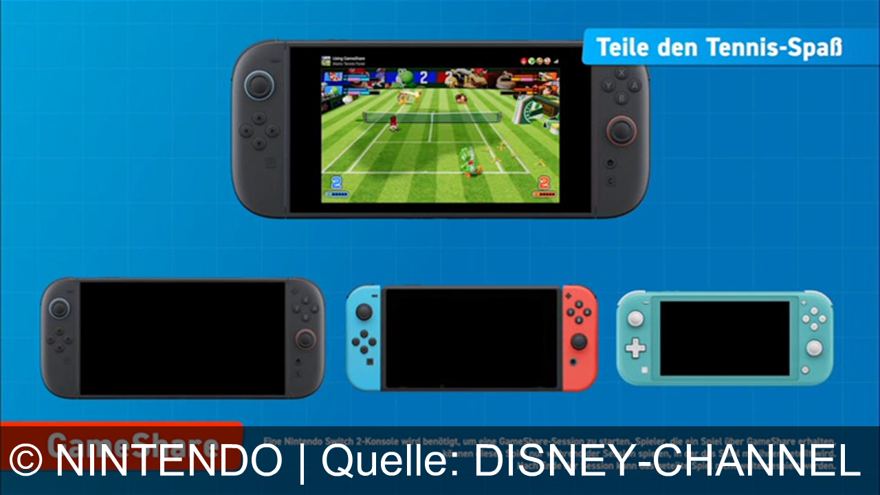 Oben läuft auf einer schwarzen Handheld‑Konsole ein buntes Tennisspiel. Darunter stehen drei weitere Konsolen in verschiedenen Farben mit ausgeschaltetem Display. Rechts oben steht ein Hinweis zum Teilen des Tennisspaßes, unten ein GameShare‑Hinweis.