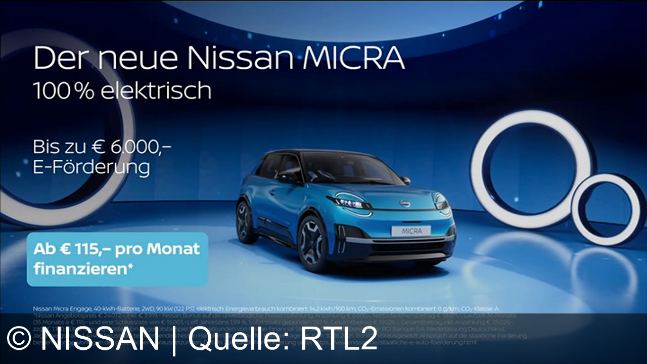 Nissan Werbung aus dem Jahr 2026 in Deutschland, mit dem von uns gewählten Titel: "Der neue Nissan Micra: 100% elektrisch, unwiderstehlich und ab 115 € im Monat" mit der Kurzbeschreibung: "Der neue Nissan Micra: 100% elektrisch, unwiderstehlicher Fahrspaß ab 115 Euro im Monat.". Diese Werbung thematisiert oder beinhaltet die Kategorie/n E-Auto, Auto, Leasing.