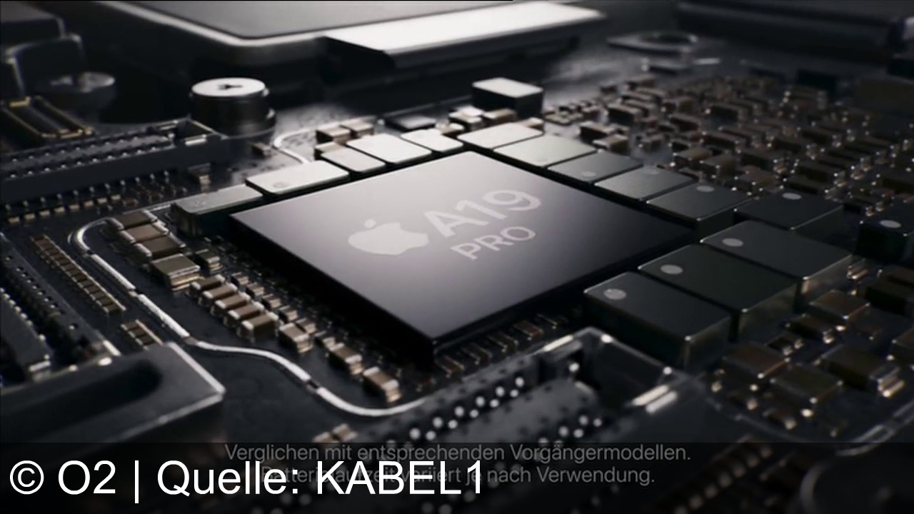 Nahaufnahme eines Computerchips mit der Aufschrift "A19 PRO" und einem Apfel-Logo. Der Chip ist von verschiedenen elektronischen Komponenten und Schaltkreisen umgeben. Unten steht ein Text: "Verglichen mit entsprechenden Vorgängermodellen. Batterielaufzeit variiert je nach Verwendung."