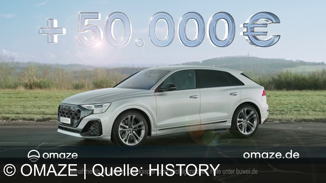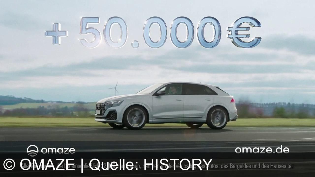 Ein silberner SUV steht auf einer Straße vor einer offenen Landschaft. Über dem Wagen hängt der fette Schriftzug +50.000 €. Unten läuft ein Hinweis zu Teilnahme und Suchtgefahr durch. Links und rechts stehen die Logos und die Webadresse von omaze.