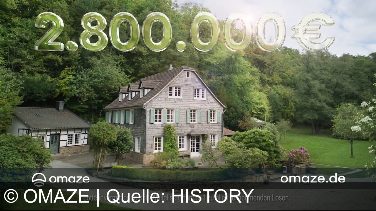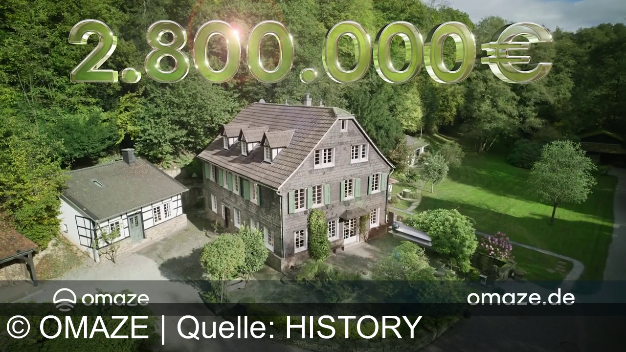 Ein großes Landhaus steht zwischen vielen Bäumen, daneben ein kleineres Gebäude. Der Hof ist sauber angelegt, vorne liegt ein runder Gartenbereich. Über der Szenerie steht die Zahl 2.800.000€. Unten erscheint der Hinweis auf omaze.de.