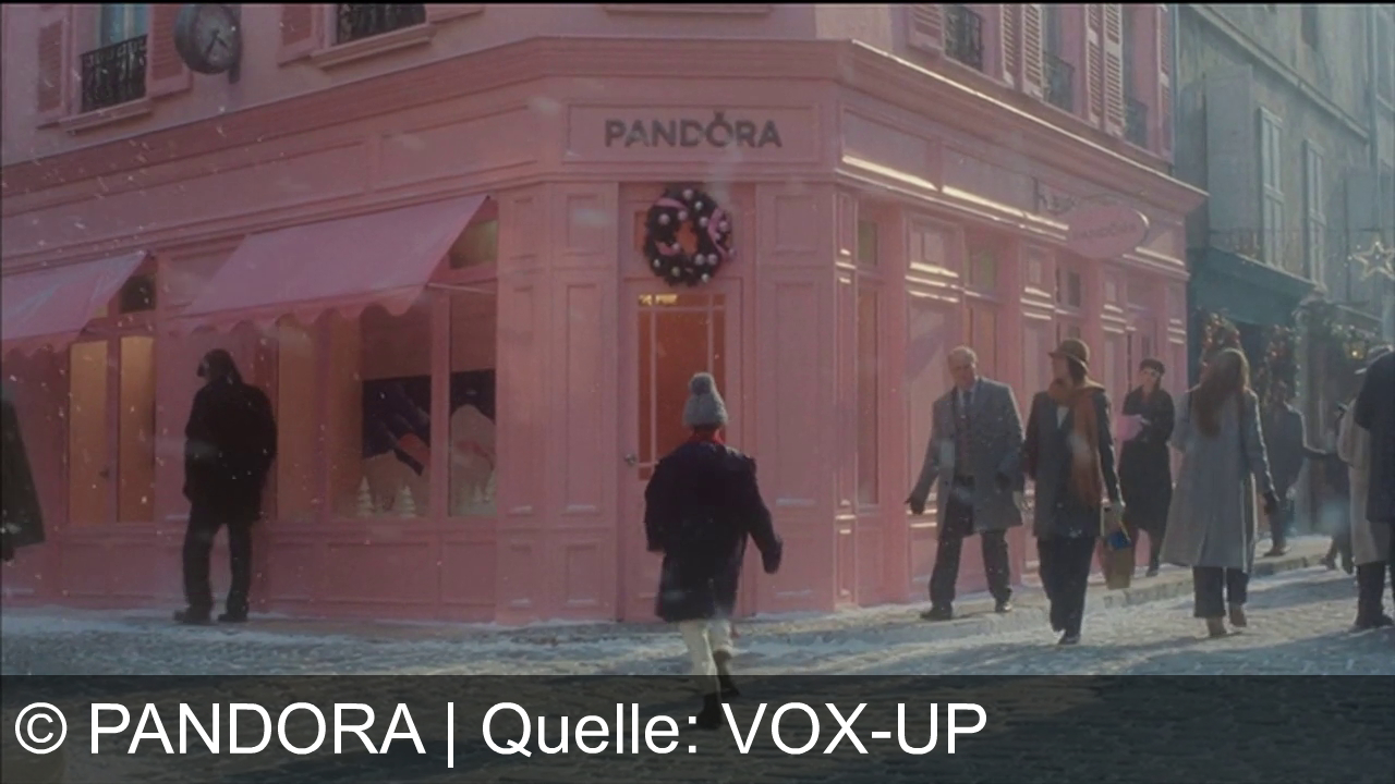 Pastellrosa Gebäude mit der Aufschrift "Pandora". Schneeflocken fallen. Ein Kind mit Mütze läuft zur Tür. Menschen spazieren auf Kopfsteinpflaster. Einige sind in Mäntel gehüllt. Weihnachtliche Dekoration, einschließlich Kranz über der Tür. Atmosphäre winterlich und festlich.