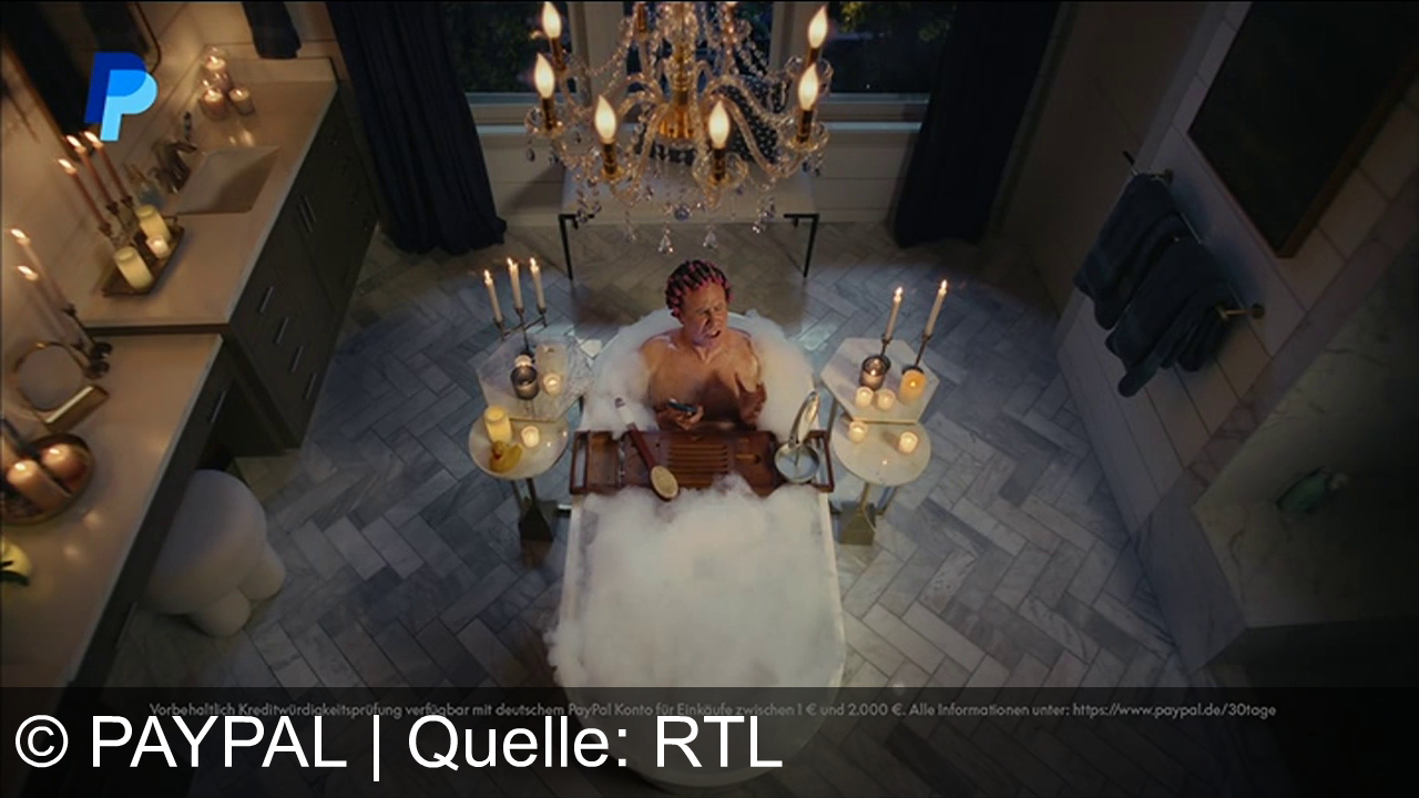 Eine Person sitzt entspannt in einer Badewanne mit Schaum, umgeben von Kerzen. Sie trägt eine rosa Badekappe und hält ein Smartphone. Über der Badewanne hängt ein Kronleuchter. Auf einem Holzbretthalter liegen ein Duschkopf und Pflegeprodukte. Im Hintergrund stehen Handtücher an der Wand. Das Logo von PayPal ist oben links.