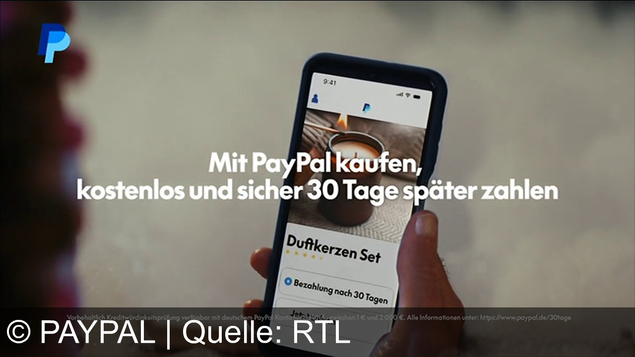 Ein Smartphone in der Hand zeigt eine Online-Shop-Seite mit einem Duftkerzen-Set. Der Bildschirmtext sagt "Mit PayPal kaufen, kostenlos und sicher 30 Tage später zahlen". Oben links das PayPal-Logo. Unten gibt es Kleingedrucktes über Kreditwürdigkeitsprüfung und weitere Infos.