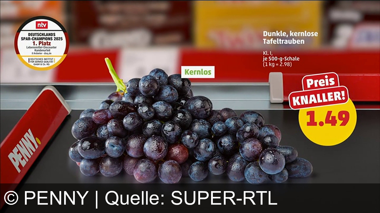 Der TV-Spot bewirbt aktuelle Sonderangebote des Lebensmitteldiscounter Penny. Im Fokus stehen dunkle, kernlose Tafeltrauben für 1,49 € und verschiedene Sorten Milka-Schokolade zum Aktionspreis von 0,99 €. Die zentrale Werbebotschaft betont die Kombination aus Genuss und Ersparnis mit dem Markenslogan „Erstmal zu PENNY“.