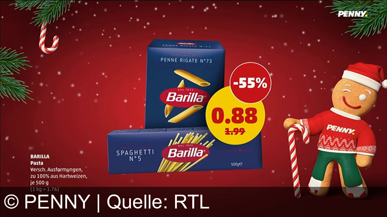 Barilla-Pasta im Angebot bei Penny. Zwei blaue Packungen: Penne Rigate Nr. 73 und Spaghetti Nr. 5. Preis reduziert um 55%, jetzt 0,88 €. Links unten Infos zu 500 g Inhalt und Hartweizen. Rechts ein Lebkuchenmann mit Weihnachtsmütze und Zuckerstange. Hintergrund rot mit Schneeflocken, oben rechts Penny-Logo, oben links Tannenzweige und Zuckerstange.