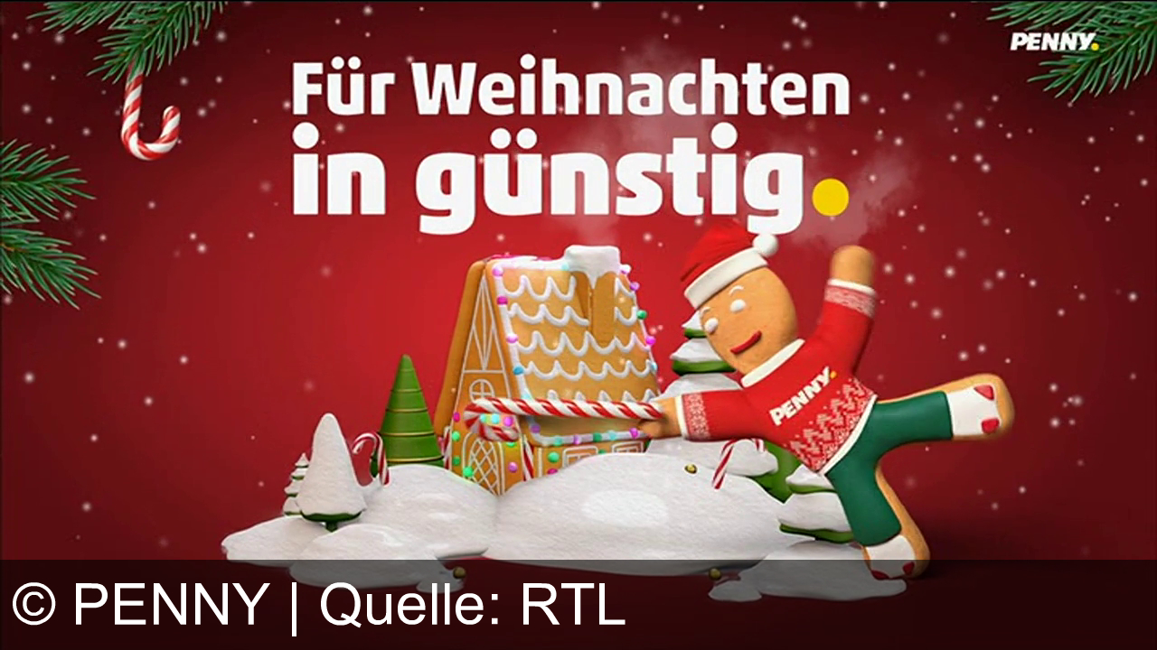 Ein Lebkuchenhaus umgeben von Schnee und Tannenbäumen. Ein Lebkuchenmann mit rotem Pullover und Zuckerstangen läuft im Vordergrund. Roter Hintergrund mit weißem Text: "Für Weihnachten in günstig." Oben rechts steht "PENNY".