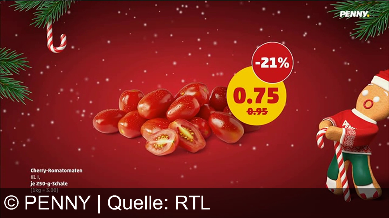 Rote Cherry-Tomaten auf rotem Hintergrund. Preisreduzierung um 21%, neuer Preis 0,75 € statt 0,95 €. Rechts ein Lebkuchenmännchen mit Zuckerstange. Oben links ein Zuckerstangenornament, oben rechts das Penny-Logo. Schneeflocken und Tannenzweige schmücken den Hintergrund. Text unten: "Cherry-Romatomen, Kl. I, je 250-g-Schale (1 kg = 3,00 €)".