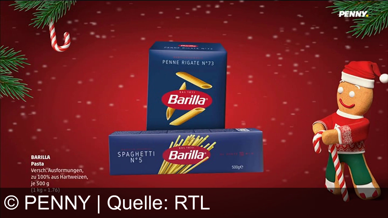 Auf rotem Hintergrund stehen zwei blaue Barilla-Nudelverpackungen: eine Penne Rigate und eine Spaghetti N°5. Links oben hängt eine Zuckerstange, links unten Produktinformationen. Rechts steht ein Lebkuchenmann in weihnachtlichem Outfit, der eine Zuckerstange hält. Oben rechts ist ein PENNY-Logo.