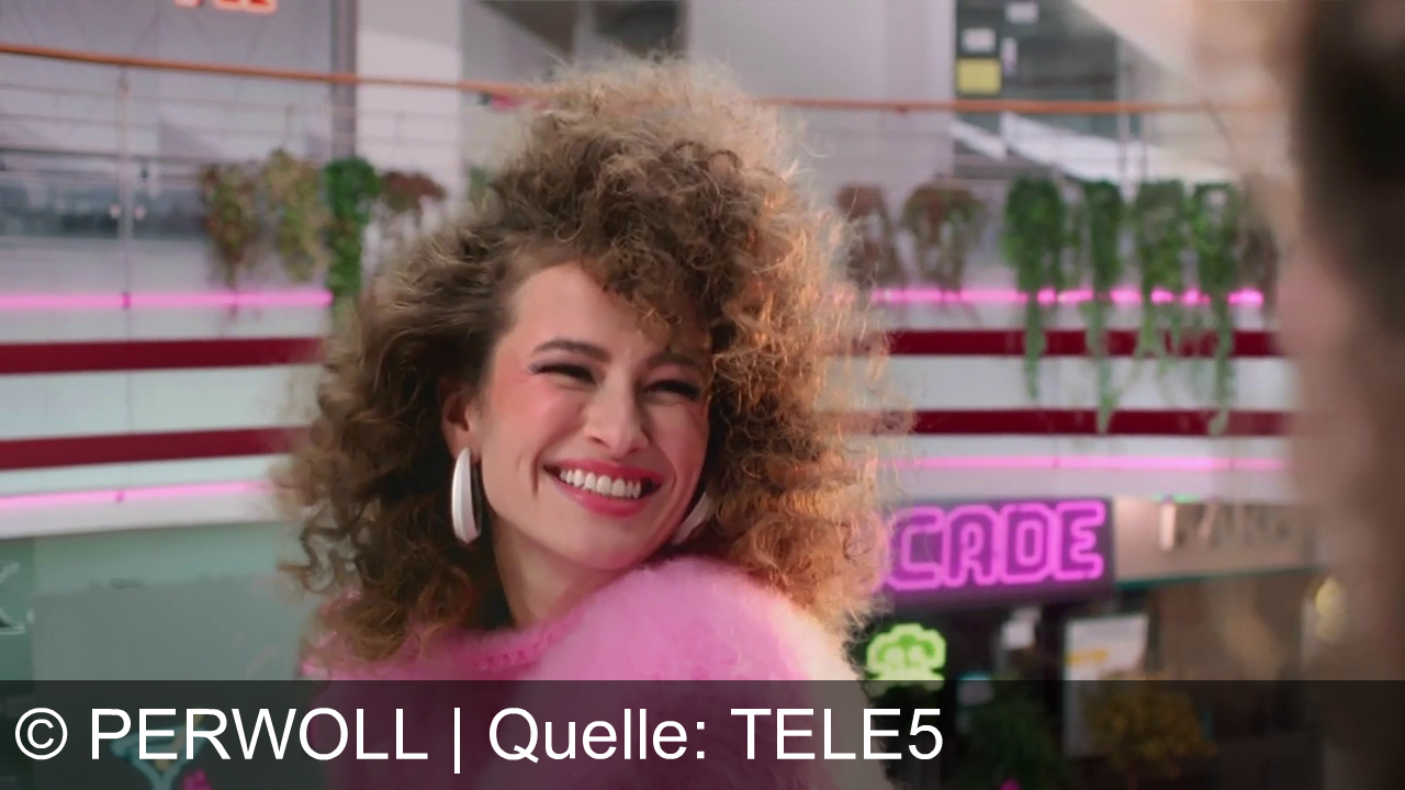 Eine Frau mit lockigen Haaren und großen Ohrringen trägt einen rosa Pullover. Im Hintergrund leuchten Schilder mit den Worten "ROCK’n’WO" und "ARCADE" in Neonfarben. Das Setting wirkt wie ein Einkaufszentrum mit pinker Beleuchtung.